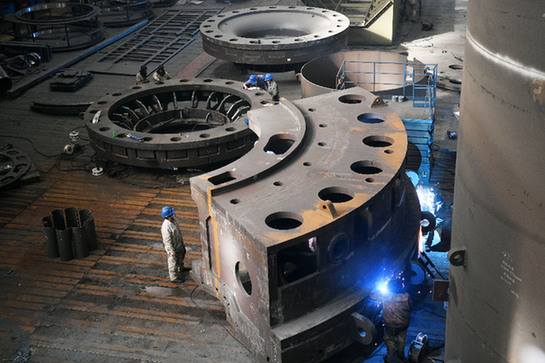 在哈電集團哈爾濱電機廠,工人正在進行水輪機頂蓋的焊接生產。記者 王建威 攝