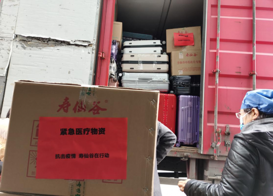 圖片說明:壽仙谷捐贈的靈芝孢子粉被裝上第二批浙江赴武漢醫療隊行李與物資車