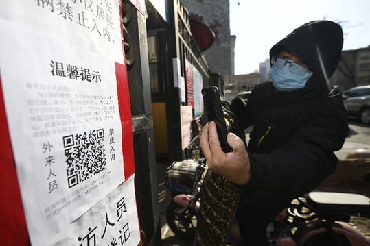 2月5日,寧夏銀川市西夏區北京西路街道疊翠園小區住戶通過掃二維碼登記信息。