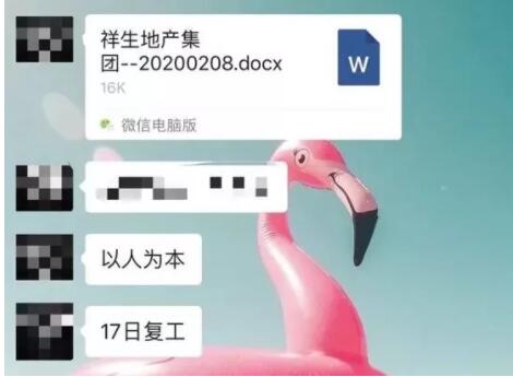2月9日,臨近復工,位于新虹的祥生地產集團在群里發了一則通知:正式復工時間為2月17日,延長的這7天內,員工都自行在家隔離,居家云辦公期間,大家通過企業微信打卡自覺保證工作時間,確保相關工作正常跟進完成。