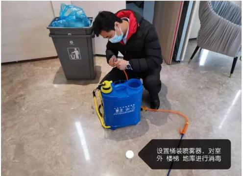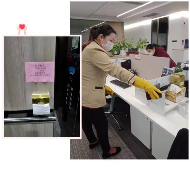 每天傍晚時分,保潔人員對整棟大樓,包括行政區域、公共區域、食堂進行消毒,并在群里匯報。