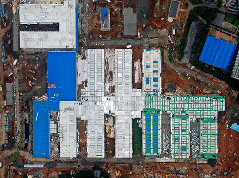 在武漢火神山、雷神山醫院建設中,基于北斗衛星導航系統的高精度定位設備火速馳援,確保工地大部分放線測量一次完成。這是無人機拍攝的武漢火神山醫院。記者 李賀 攝
