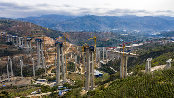 近期,中老鐵路玉溪至磨憨段有序復工復產,由中鐵四局承建的中老鐵路全線重點控制性工程——元江特大橋、南溪河特大橋正在加緊施工建設。這是南溪河特大橋橫跨在建高速公路。記者 江文耀 攝