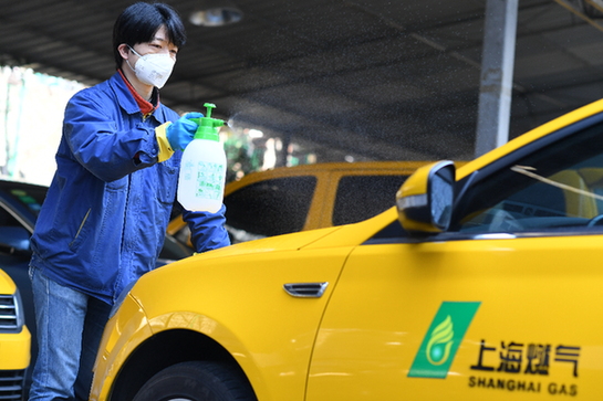 上海燃氣檢修人員對待命中的出勤車輛進行消毒。(企業供圖)