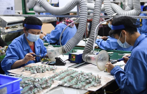 2月27日,廣州市倍爾康醫療器械有限公司工人在額溫槍生產流水線上作業。(記者 鄧華 攝)