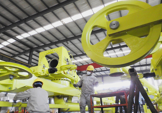 江蘇連云港遠洋流體裝卸設備有限公司的工人正在加緊安裝一批海外訂購的流體裝卸臂。新華社發(耿玉和 攝)
