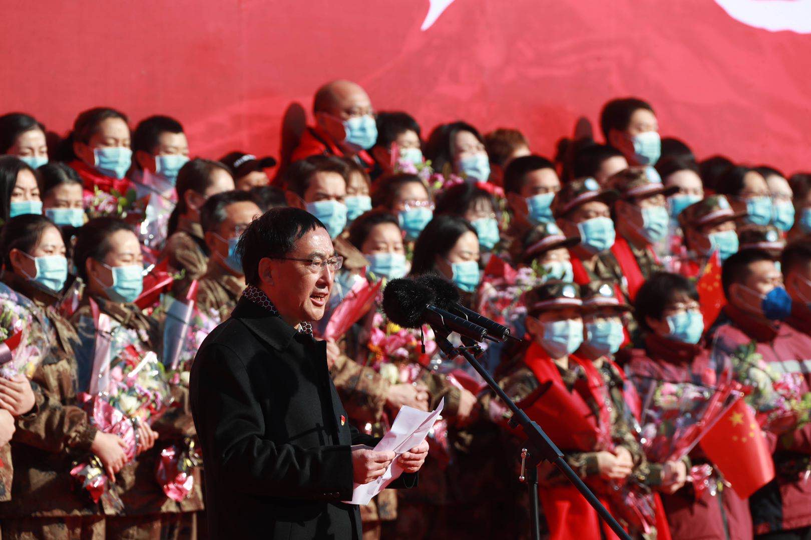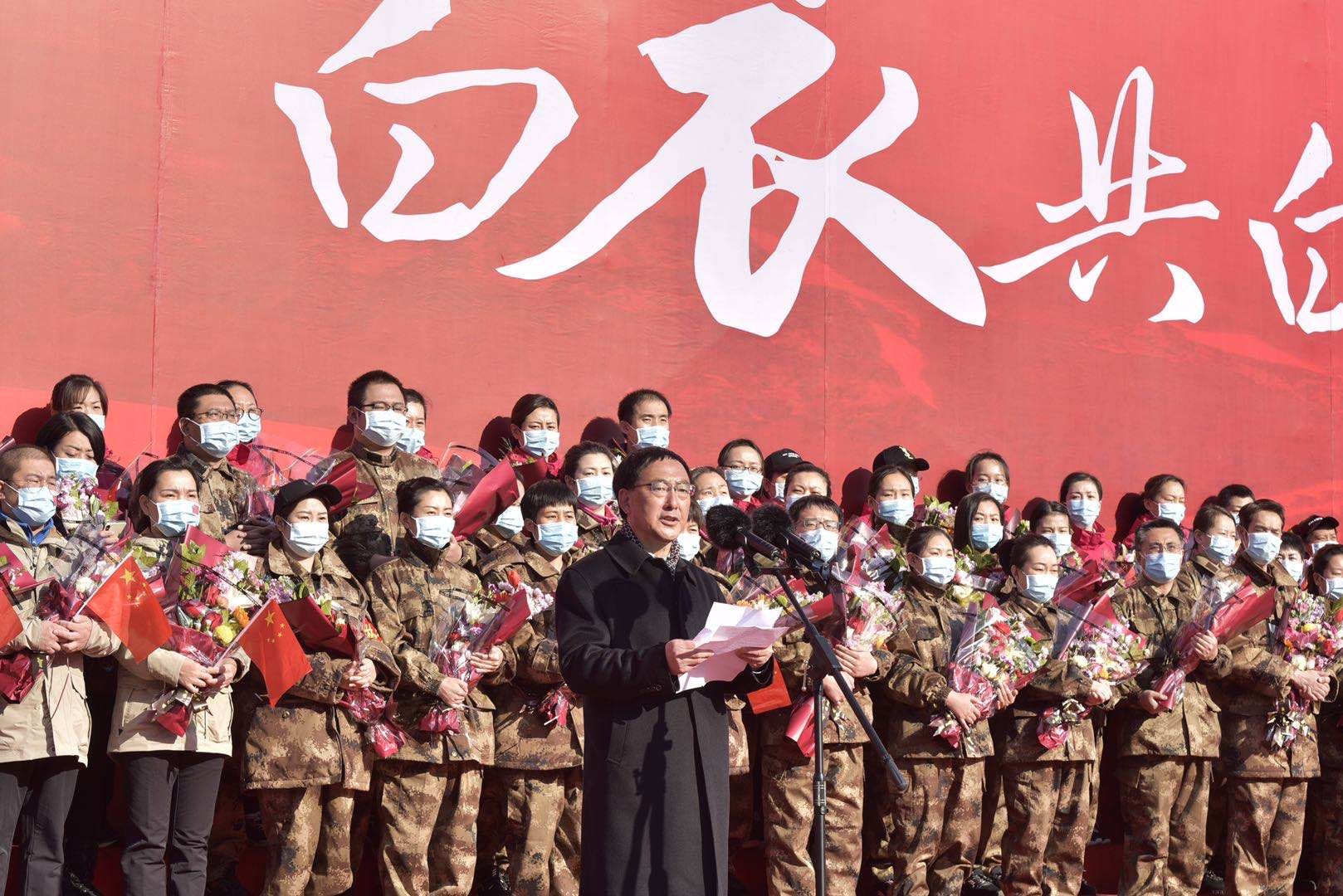????長白山管委會二級巡視員祖德文在儀式上代表長白山人民發表了熱情洋溢的致辭。祖德文說,兩個多月前,你們聽從習總書記的號令,與全國各地支援湖北醫療隊一道,舍小家顧大家,舍身取義、舍生忘死,義無反顧奔赴抗疫一線,保衛武漢、保衛湖北!你們始終堅持把人民群眾身體健康和生命安全放在第一位,同時間賽跑、與病魔較量,以優良作風和精湛技術挽救了一個又一個生命,用實際行動譜寫了一曲感天動地、氣壯山河的生命贊歌!