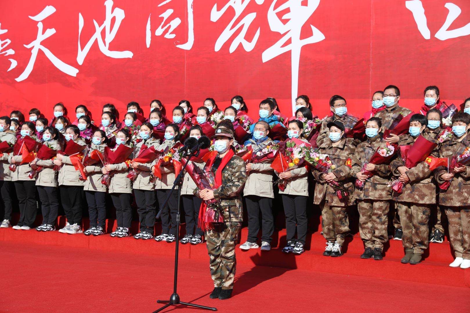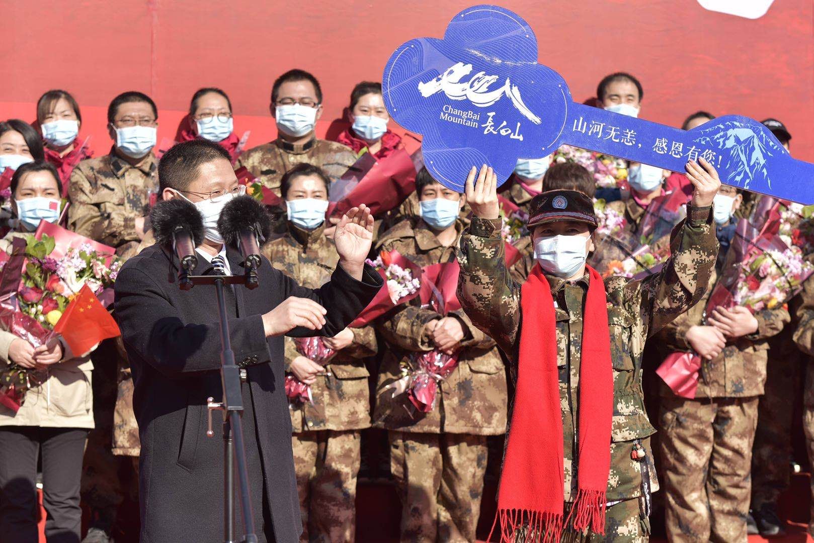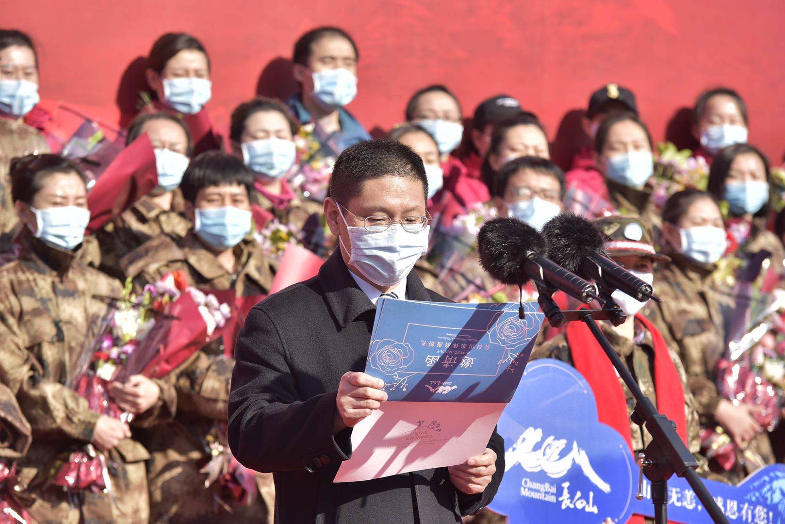 ????長白山衛健局局長張在茂主持儀式。省衛健委副主任楊春光、省衛健委王哲、通化市衛健委于鳳翔、長白山管委會旅游文體局耿德勇、白山市衛健委孫學明、公主嶺市衛健局林澤禮、吉林省前衛醫院李海波,以及相關部門、長白山池北區群眾、各地迎接抗疫英雄的車隊等3000余人參加了歡送儀式。