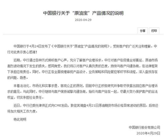 4月24的說明中,中行稱,針對“原油寶”產品掛鉤WTI 5月合約負結算價格事宜,中行持續與市場相關機構溝通,就4月20日市場異常表現進行交涉。而在此次最新發布的29日說明中,中行明確表示,在近日,中行已委托律師正式向CME發函,敦促其調查4月21日原油期貨市場價格異常波動的原因。后續還將加大相關工作力度。