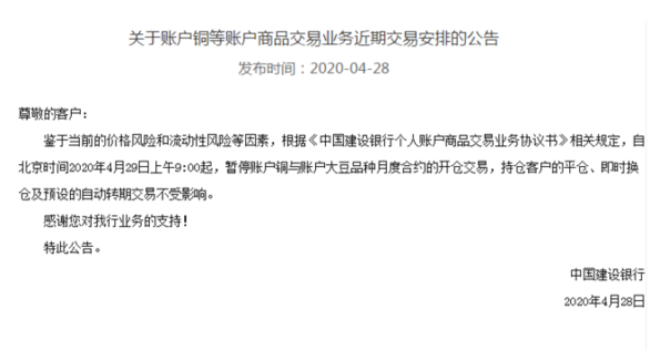 4月28日,中國建設銀行發布公告稱,鑒于當前的價格風險和流動性風險等因素,自北京時間2020年4月29日上午9:00起,暫停賬戶銅與賬戶大豆品種月度合約的開倉交易,持倉客戶的平倉、即時換倉及預設的自動轉期交易不受影響。