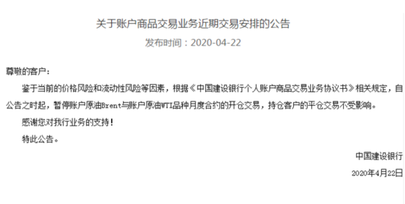 而在此之前的4月22日,中國建設銀行就已暫停賬戶原油Brent與賬戶原油WTI品種月度合約的開倉交易。并且同步公告稱,有權調整賬戶商品交易業務WTI2006合約的到期處理時間和處理規則,對客戶到期未平倉持倉進行現金結算。