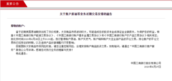 4月27日,中國工商銀行發布公告稱,為保護投資者權益,自北京時間2020年4月28日上午9﹕00起,該行暫停賬戶原油、賬戶天然氣、賬戶銅和賬戶大豆全部產品的開倉交易,持倉客戶的平倉交易和已經預設的轉期,以及連續產品份額調整均不受影響。