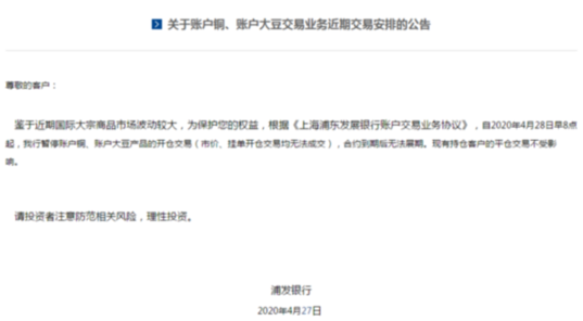 同日,浦發銀行也發布公告稱,自2020年4月28日早8點起,該行暫停賬戶銅、賬戶大豆產品的開倉交易(市價、掛單開倉交易均無法成交),合約到期后無法展期?,F有持倉客戶的平倉交易不受影響。?此前浦發銀行于4月23日發布公告自4月24日起暫停賬戶原油產品的開倉交易。