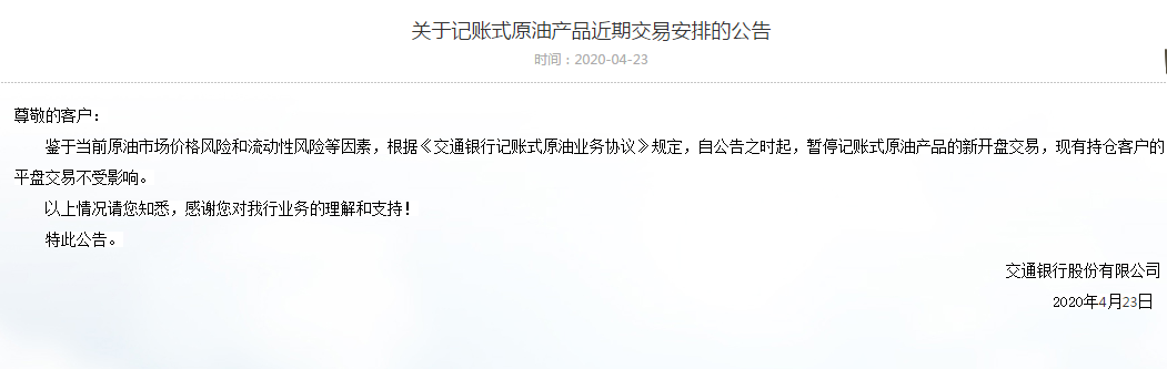 4月23日,交通銀行也暫停了記賬式原油產品的新開盤交易。
