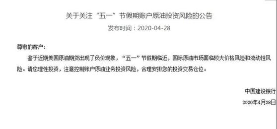 4月28日,中國建設銀行發布公告稱:鑒于近期美國原油期貨出現了負價現象,“五一”節假期臨近,國際原油市場面臨較大價格風險和流動性風險。請您理性投資,注意控制賬戶原油業務投資風險,合理安排您的投資交易倉位。