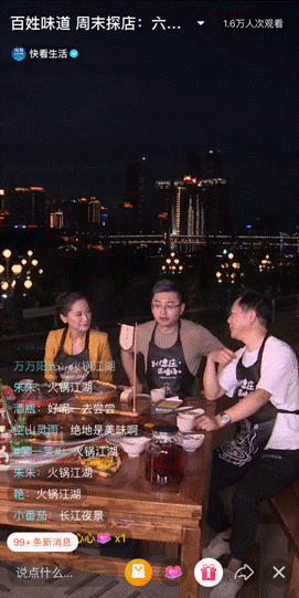 身處著名的重慶南濱路,可以看到長江索道飛躍南北,江中輪船往來穿梭。直播一開始,身為東道主的六神磊磊便為初來重慶的主播介紹了地理方位和標志建筑:渝中、南岸、東水門長江大橋、長江索道、來福士廣場……江風徐徐,景色迷人,火鍋沸騰,美食登場。