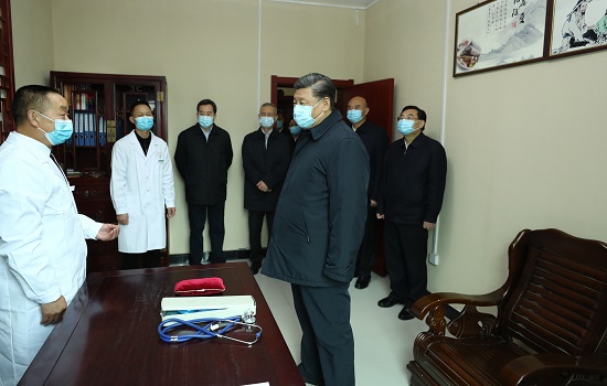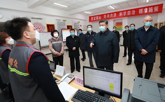 2020年2月10日,中共中央總書記、國家主席、中央軍委主席習近平在北京調研指導新冠肺炎疫情防控工作。這是習近平在朝陽區安貞街道安華里社區,了解基層一線疫情聯防聯控情況。