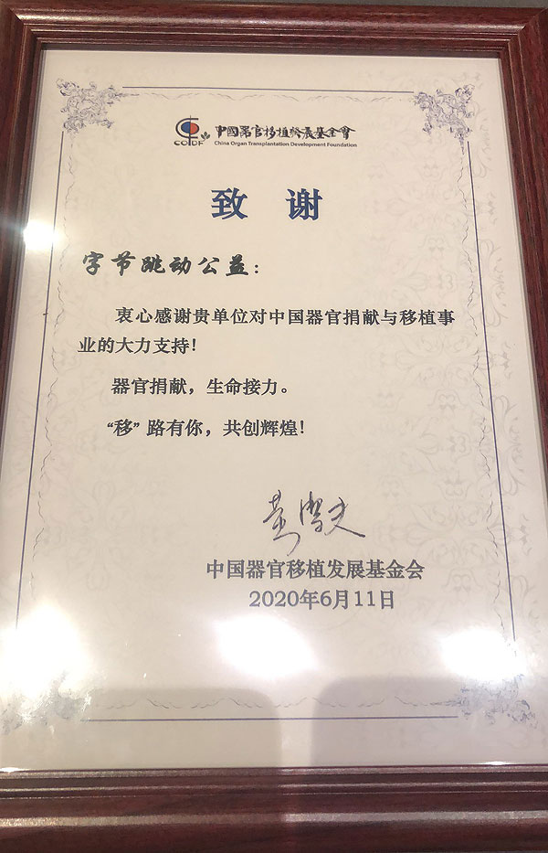 中國器官移植發展基金會為本次活動中支持中國器官捐獻與移植事業的公益支持方頒發感謝狀。(圖片來源:中國器官移植發展基金會)