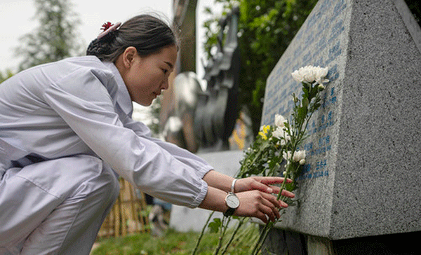 2019年4月3日,醫務工作者代表在活動現場向捐獻者紀念碑獻花。 新華社記者江文耀攝