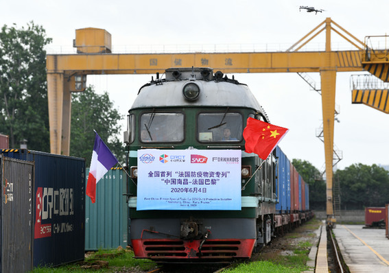 6月4日上午,開往法國巴黎的防疫物資專列由南昌(向塘)國際陸港橫崗站出發。此趟專列將在3周內行駛近1.4萬公里,到達法國巴黎。