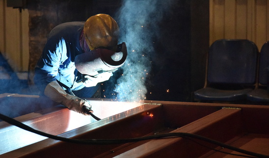 工人在中車齊車公司廠房內焊接C70E型貨車。新華社發(唐鐵富 攝)
