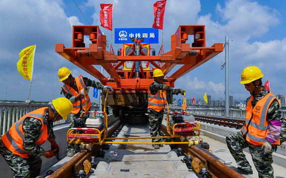 中鐵四局施工人員正在進行高鐵長軌鋪設作業。中鐵四局供圖