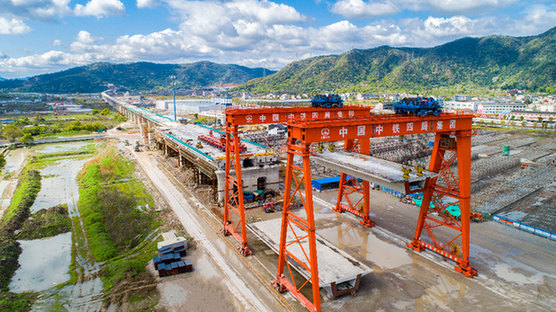 中鐵四局承建的杭(州)紹(興)臺(州)鐵路正在進行提梁架設作業。中鐵四局供圖