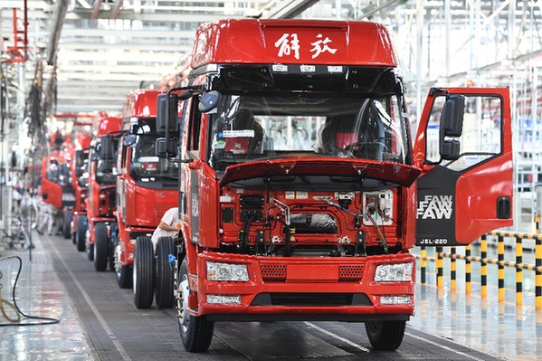 在位于長春的一汽解放總裝車間,車輛在生產線上等待裝配。中國一汽前三季度銷售整車超265萬輛,同比增長8%。記者 張楠 攝