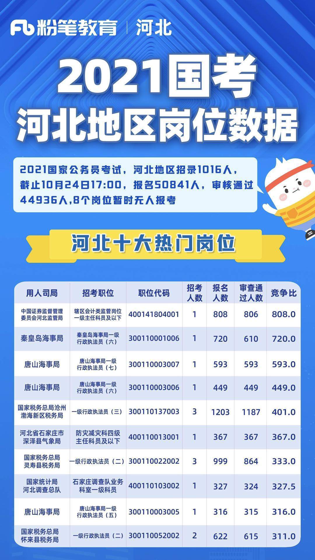 根據粉筆教育河北分校介紹,在2021國家公務員考試中,河北考區提供502個職位,招錄1016人。截止24日17時,報名已達到50841人,審核通過44936人,有8個崗位無人報考。其中,中國證券監督管理委員會河北監管局“轄區會計類監管崗位一級主任科員及以下”一職報名人數808人呢,競爭比為808:1,秦皇島海事局“一級行政執法員”一職則有702人報名,競爭比是720:1,排名第二?!?/p>