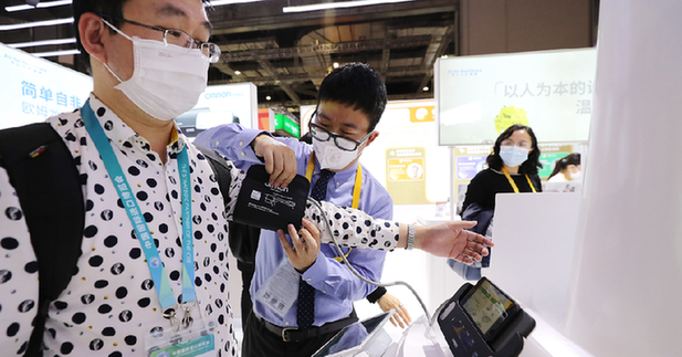 11月5日,工作人員(左二)在協助參觀者體驗歐姆龍公司一款心電一體血壓計。該款血壓計通過與智能手機連接實現血壓和心電圖同步檢測。