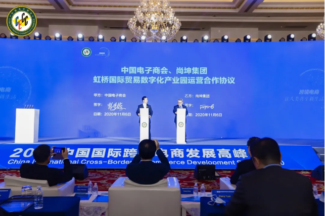 會上,閔行區人民政府與中國電子商會簽訂了“虹橋國際貿易數字化產業園”合作協議,閔行區委常委、副區長吳斌和中國電子商會秘書長彭李輝代表雙方簽約并為園區揭牌,強強聯手共同搭建貿易數字化功能性服務平臺,推動貿易數字化企業在虹橋商務區的集聚與產業生態的發展與創新。通過園區的落戶建設,將進一步夯實貿易數字化發展基石,引導與幫助數字化企業更好承接發展新商機。