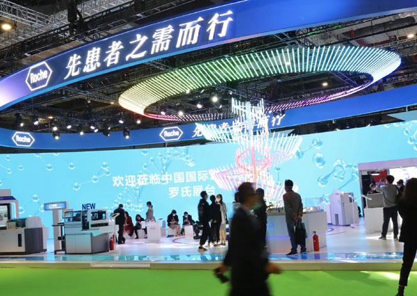 11月5日,參會者經過醫療器械及醫藥健康展區的羅氏展臺。新華社記者 張玉薇 攝