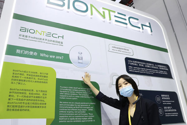 11月5日,工作人員在醫療器械及醫藥健康展區現場介紹由復星醫藥與德國拜恩泰科合作開發的新冠病毒mRNA(信使核糖核酸)疫苗。新華社記者 張玉薇 攝