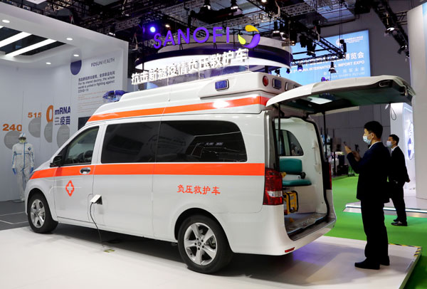 11月5日,在公共衛生防疫專區,復星醫藥展出負壓救護車。新華社記者 劉穎 攝