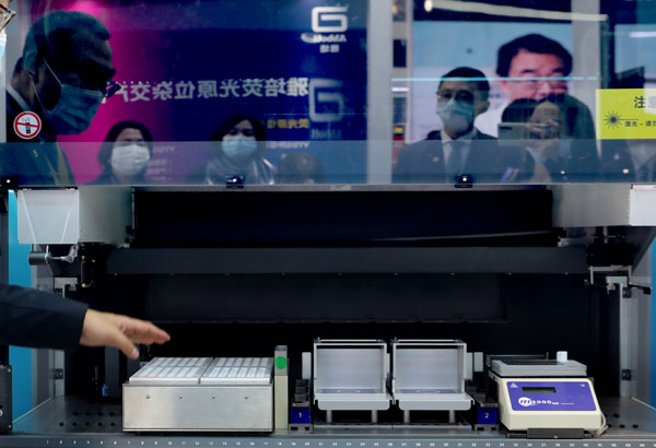 11月5日,在公共衛生防疫專區雅培展臺,工作人員向參觀者介紹全自動核酸分析系統。新華社記者 劉穎 攝
