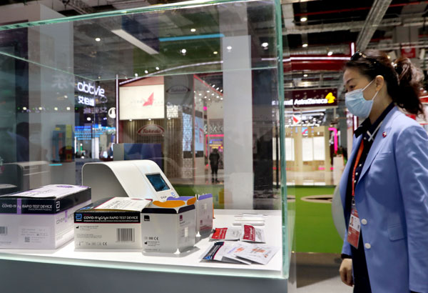 11月5日,在公共衛生防疫專區,參觀者觀看雅培展示的便于攜帶且適用于大規模檢測的新冠病毒快速抗原檢測試劑和產品。新華社記者 劉穎 攝