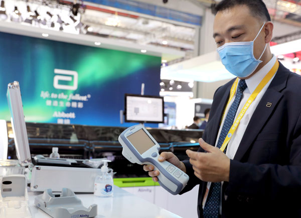 11月5日,在醫療器械及醫藥保健展區雅培展臺,工作人員展示手持式血液分析儀。新華社記者 劉穎 攝