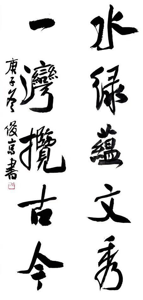 余觀劉俊京先生之行書,典麗清勁,華英深秀。此以應夏氣蕃秀之理也。其行書以魏碑為實,以南宮為意,以山谷為精神。用筆跌宕磊落,瀟灑俊逸。筆鋒開拓而瑰麗,結體穩健而嚴謹。于厚實處能變幻出飄逸之意趣,在整飭中可流露出險峻之結體。東坡所云:端莊雜流麗,剛健含婀娜,當是此意也。是以,余以為讀其行書如綠水明漪,宛若清揚。翠環凝碧,夜雨鳴廊。凝想方潔,思之不忘。