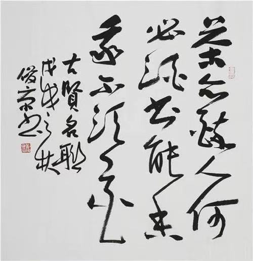 余觀劉俊京之草書,凌厲恣肆,圓健沉雄。此以應秋氣容平之理也。其草書是以行書之筆而起,卻以草書之意而作,酷肖米癲之狂態,然卻無酒肆市井之氣。筆鋒轉折圓潤,點畫華滋高潔。于沉著間意態痛快淋漓,在痛快處筆畫沉著凝重。使人讀來忽有仁智山水之思,而生煙霞林泉之想;著天風海浪之情,以見云鶴驚鴻之姿。