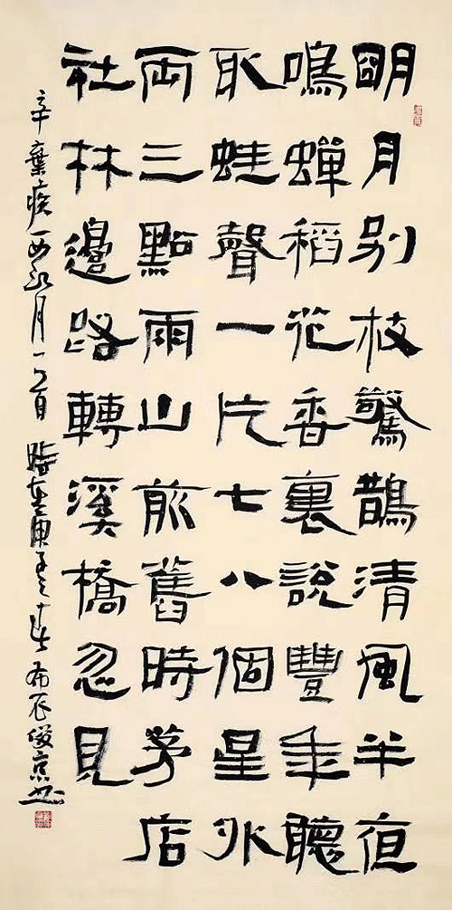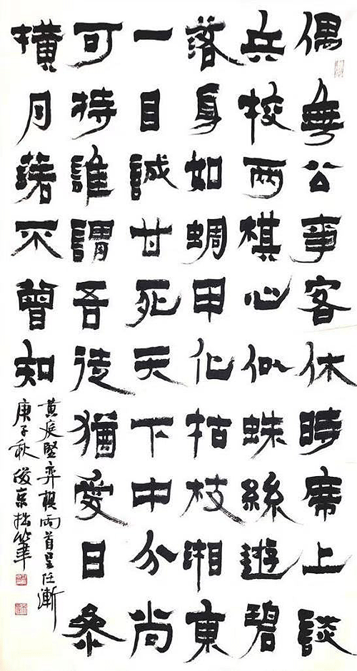 余觀劉俊京先生之隸書,沉厚樸實,規整奇崛。此以應冬氣閉藏之理也。其隸書是以金農為基石,兼有《西狹頌》、《開通》之法脈。于規矩中游刃有余,乃是追尋“使志若伏若匿,若有私意,若已有得”之理也。其隸書結構嚴密,多內斂之勢而少外拓之筆,點畫方正,厚中取逸。使人如與老僧對坐,相與忘言。奇石岌岌,枕流聽泉。秋江晚霽,寒江漁船。