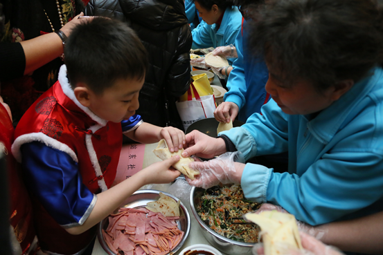 咬春現場,孩子們跟著社區志愿者學習卷春餅