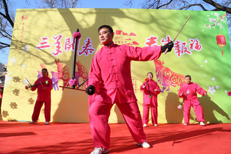 鬧春現場,文化志愿者表演地區特色“打花棍”