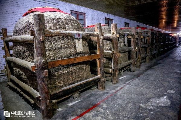 寶雞古稱陳倉,黃河最大的支流渭河流經這里。西鳳酒就產于寶雞市鳳翔縣柳林鎮。這些存酒的老酒海高三米,直徑兩米五左右,一般可存儲五六噸酒。其采用生長在秦嶺北麓800米以上的多年野生荊條編制成大簍,然后用豆腐填充縫隙,再用茍樹皮紙、白棉布敷上用蛋清等調制的生物膠裱糊上百層,最后以蜂蠟、菜籽油涂裱而成,整個制作過程要一兩年的時間。