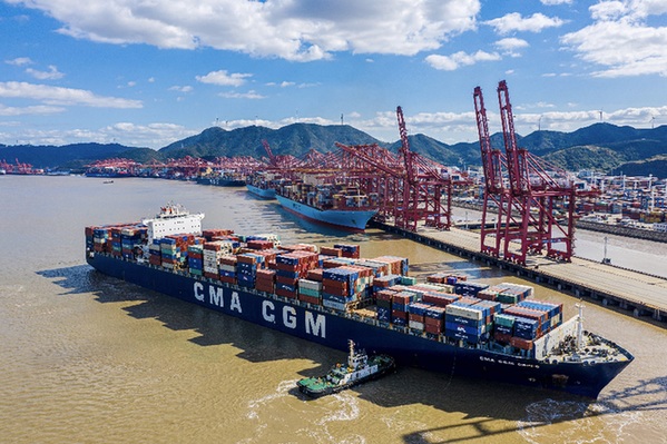圖為寧波舟山港穿山港區集裝箱碼頭生產作業場景。湯健凱 攝