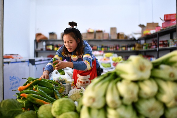 在西藏昌都市丁青縣尺牘鎮農貿市場,商販在整理蔬菜。記者 詹彥 攝