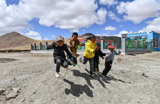 在我國海拔最高的行政鄉——西藏山南市浪卡子縣普瑪江塘鄉,小朋友們在新建成的幼兒園前玩耍。記者 晉美多吉 攝