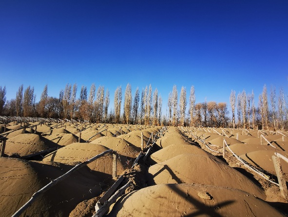 據介紹,陽關林場原有高大喬木枯枝落葉腐殖后,有機質多年聚集,促進了細沙成土,改變了沙地性質,使得流沙趨向固定。而在當地種植葡萄,枝干需埋土防寒,秋冬埋土、春季出土要進行兩次土壤大翻動,人力作用使得地表沙質疏松,形成流動沙土。從當年11月到翌年4月,葡萄園地表土裸露時間長達半年,而冬春季節大風天氣頻繁,不僅人為制造了大面積沙塵源,還加劇了林地土壤風蝕。