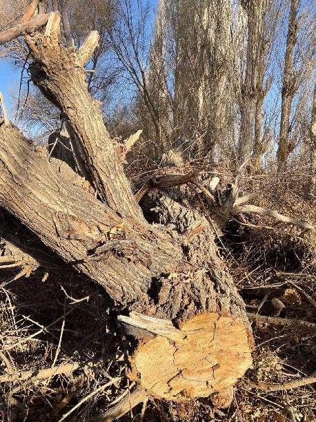 當地知情人士向記者逐一指認,幸存下來的樹木分布于林場西側和西南角兩塊面積不大的林地,以及林場主干次道兩側的行道樹、一些地塊的間隔樹。兩位曾在陽關林場工作20多年的職工對記者說,曾親眼看見被成片砍掉的新疆楊、檉柳、胡楊等樹種,老化枯死的“老年樹”和病死樹只占極少部分,大片正值青壯年的樹木像遇到推剪一樣,一棵不留地被推倒,上萬畝林子被“剃光頭”。