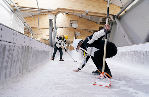 工作強度最大的制冰師,平均作業溫度達到零下30度左右,此次更是全員留崗。姚遠介紹,為了保障國家隊訓練順暢,制冰師需要早上四、五點就到冰場進行冰面檢查和修整,直到國家隊晚上九點左右訓練后,制冰師仍需持續對冰面進行除霜、修復、調整,以保障國家隊當天和第二天的訓練。
