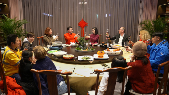 在武漢生活多年的外國人克萊因、海龍、高佑思,春節期間在武漢與雷神山、火神山醫院建設者,外賣小哥等共同慶祝新年。記者 熊琦 攝